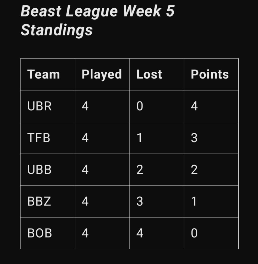 BEAST LEAGUE https://www.youtube.com/watch?v=tlVCehhw9zoFINAL*UBR 4 VS 0 UBBhttps://www.youtube.com/watch?v=PdFlBU0N78o&tSEMI FINALSUBR 4 – 0 BBZTFB 1 – 3 UBB https://www.youtube.com/watch?v=hYsNII1CFuY